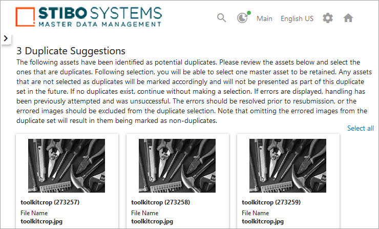 Note: If none of the images presented in the Duplicate Suggestions screen are duplicates, none will be selected. Clicking the Continue button and confirming that all images are non-duplicates skips the Select Master page and runs the image deduplication handler.