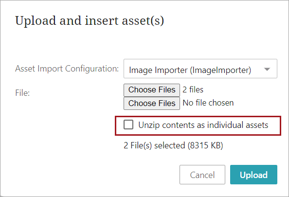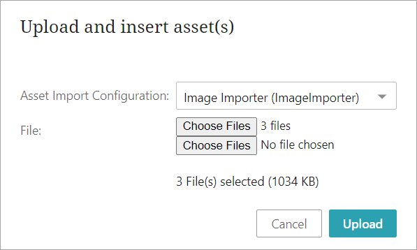 - In the 'Upload and insert assets(s)' dialog, select the desired importer configuration from the dropdown menu.