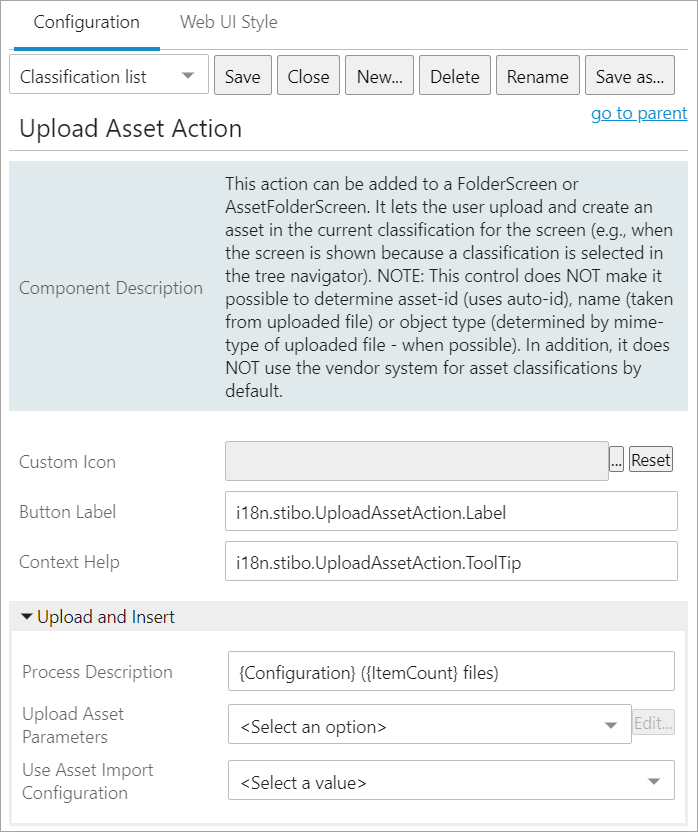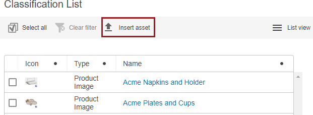 - Navigate to the relevant Classification folder in Web UI and click the 'Insert asset' button (the Upload Asset action).