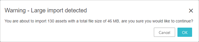 - If the threshold of 100 files or the total import size exceeds more than 100MB, a warning will be displayed informing the user about the magnitude of the import, asking for confirmation to continue the import process