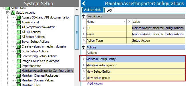 - In the 'MaintainAssetImporterConfigurations' node created in the previous step, navigate to the 'Action Set' tab, and click Add Action found under the 'Actions' flipper.