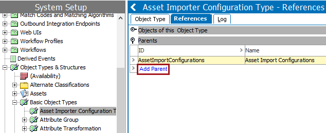 - Navigate to 'Object Types and Structures' > 'Basic Object Types' > 'Asset Import Configuration Type', and click the 'References' tab.