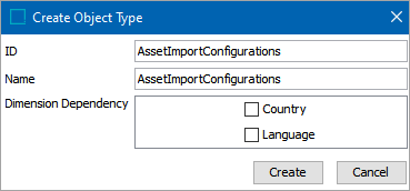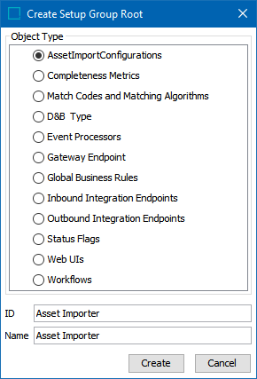 - In the window that appears, enter 'AssetImportConfigurations' in the ID parameter, then click Create. This creates a setup group in which all import configurations will reside.