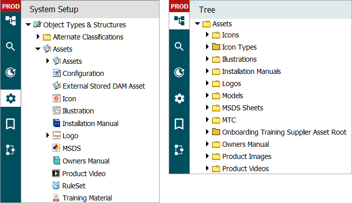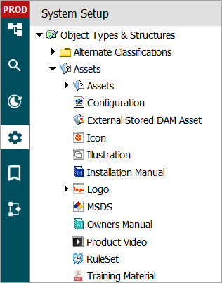On older systems, you may observe asset object types that are file-type specific. For example: JPG Image, Word Document, etc. For newer installations, this file type approach is generally not used, and instead, it is recommended to use object types that convey information about the asset's use (as shown above), rather than the file type. This is done for clarity as it is often more important to understand the purpose of the asset. For example, an asset is not just a PDF file, instead it is an Installation Manual, a Product Brochure or an Owner's Manual. One advantage of the purpose-based setup is that it is possible to restrict reference types to point to the specific types of assets and not just to generic file types.