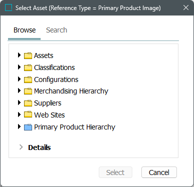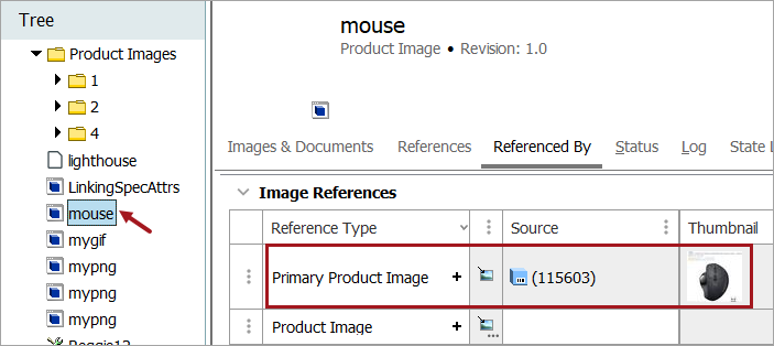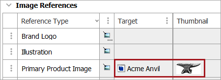 Note: When assets are linked to products, you must designate what type of reference is being made. For example, is it an image that represents the product? Is it an accessory to the product? Or a related document? This reference type denotes that the image being linked to the product is a direct representation of that product. When you make such a reference, a thumbnail of the image is attached to the product. The thumbnail will only appear for this reference type. It is possible to link more than one image to the reference type if the reference type is set to allow multiple references 'yes.'