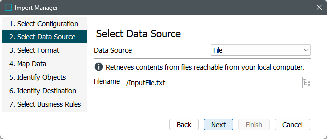 Go to File and select Import, then Data. On the 'Import Manager' window, navigate to the 'Select Data Sources' step and click the ellipsis button (