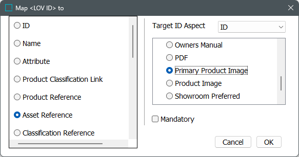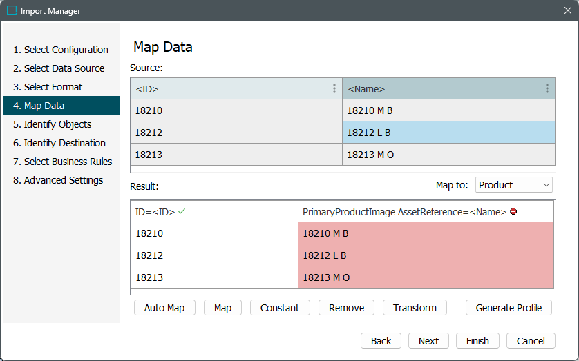 Proceed to the 'Map Data' step. Select a source column and click the Map button. Map the column holding IDs to 'ID', map the column holding the asset to be referenced to 'Asset Reference'. After selecting the 'Asset Reference' radio button, select the 'Primary Image' radio button. For more information on mapping, refer to Inbound Map Data - Map topic in the Data Exchange documentation.