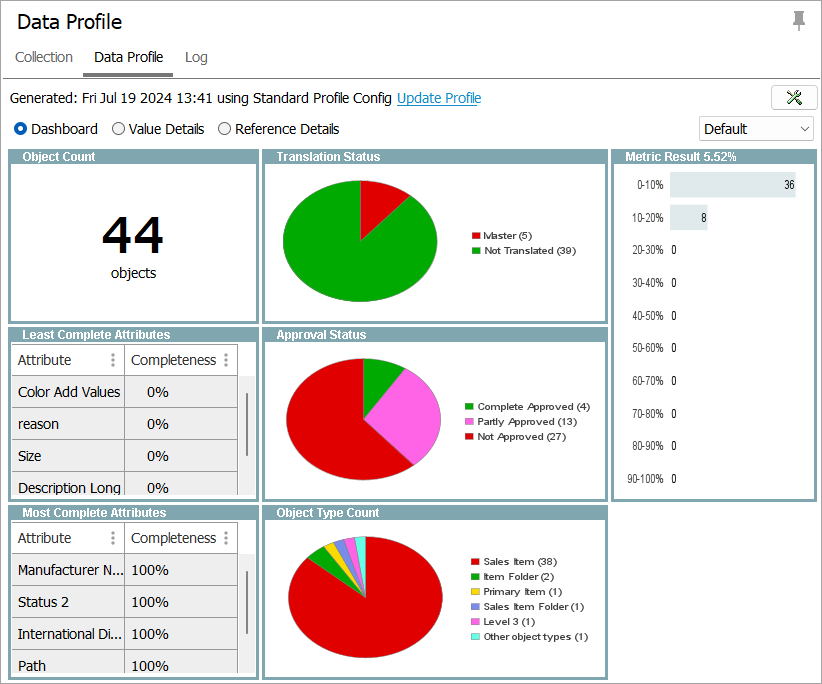 The Data Profile tab can display a dashboard to provide a graphical representation of the objects that are in the collection. This can be modified based on the user's requirement.