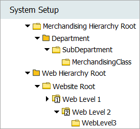 The allowable structure of objects and hierarchies that are accessed in the Tree are defined in System Setup. Continuing with the above example, we can observe that the defined object types and structures include a Primary Product Classification that has a number of levels. A Level 1 can only have a Level 2 child, which in turn can only have a Level 3 child. However, a Level 3 object type can have a number of child object types, including an Item Folder, Level 4, and a Sales Item Folder. A Sales Item Folder is a child of a Level 3 object type, as mentioned, but can also be a child to a Level 4. Similarly, a Sales Item can be child to multiple things, including a Sales Item Folder and a Sales Item Family.