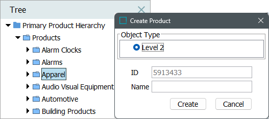 The objects and structures available in the Tree will vary based on your particular data model, but the concepts described can be applied across any data model. Regardless of the specific names or structures, each node on the Tree tab is an individual object that has a defined "place to live" within a hierarchy. A user can right-click on many of these objects and have a 'New...' option, such as 'New Product' or 'New Classification', allowing them to create a new node in the hierarchy. For example, when right-clicking on the 'Apparel' object and selecting 'New Product', a dialog appears with an option to create an object with one of a few possible object types.