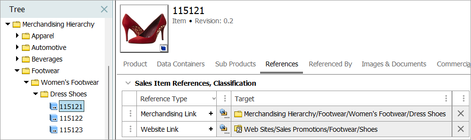 Object super types can only exist within their designated hierarchy types. To clarify, a product hierarchy (blue hierarchy) can only contain object types of the product super type, while an entity hierarchy (gray hierarchy) can only contain objects of the entity super type. It is possible to have the visual appearance of mixed hierarchies, but this is accomplished via references rather than actual data structures. For example, products in the Tree may appear to be within a classification hierarchy, but this is due to references on the object, as shown below.