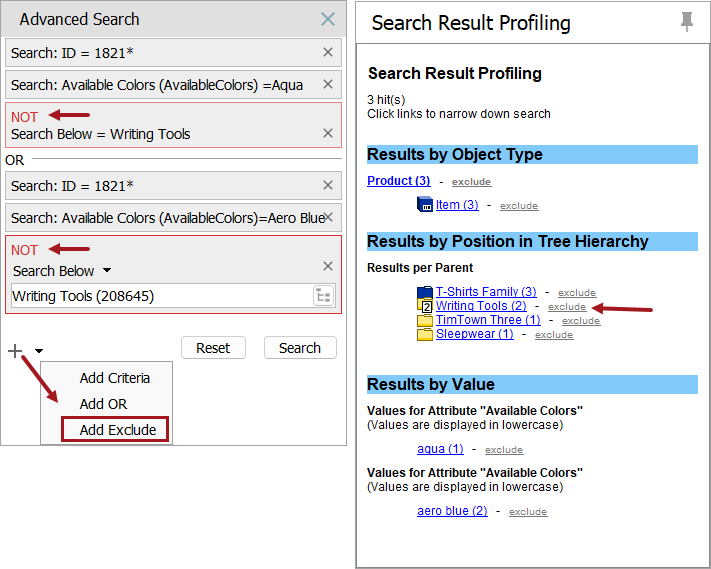 ), then select 'Add Exclude' or click an 'exclude' link in the generated 'Search Result Profiling' panel after displaying search results.