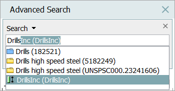 If you enter a text string and click the Search button, search finds objects with an ID, and/or a name and/or an attribute and/or their values matching the entered string. You can further refine standard searches as shown below.