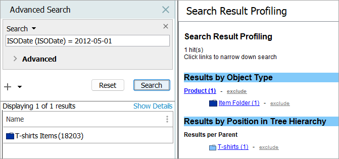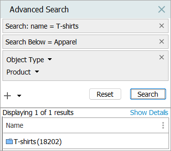 As an example, the search shown below finds objects that have the value 'Red' for the 'Color' attribute AND that are present below an 'Apparel' hierarchy node. The order of criteria does not impact the results.