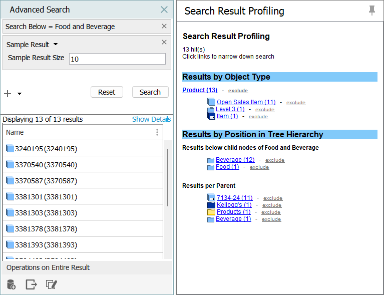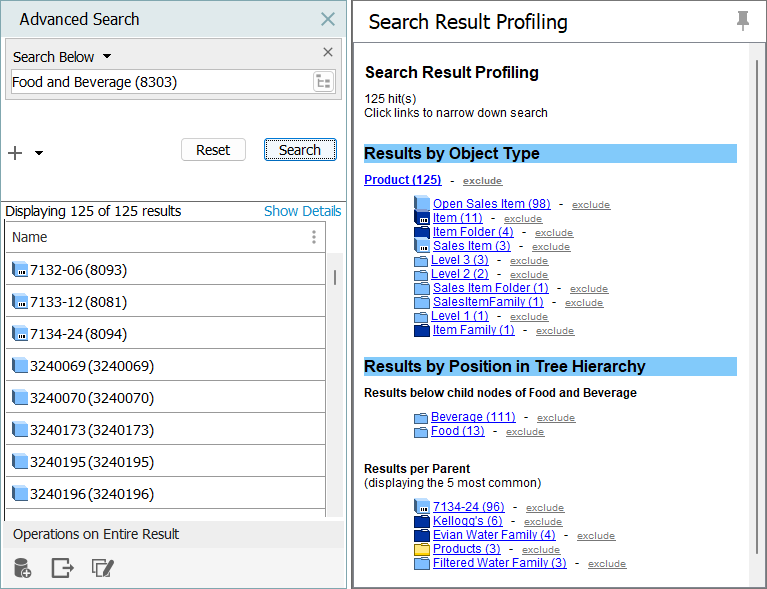 For example, a user searches for a set of products below a hierarchy that displays a set of results which has 125 products. To do so, on the Advanced Search tab add a Search Below criterion and select the appropriate node to search below. For more on how to search below, refer to the Advanced Search: Search Below topic.