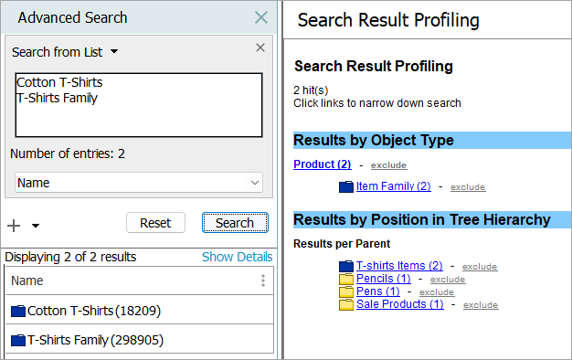 - Inherited attribute values (hierarchical inheritance) can be specified in the data list. The result set includes the object that contains the searched value as a local value. While this object may not match an object type restriction, it points to the origination of the searched text.