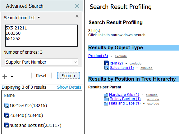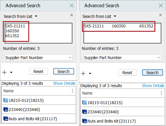In this example, the search results display with the Supplier Part Number that holds values specified in the data list.