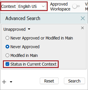 • Status in Current Context: When this box is checked, only the current context is searched. If unchecked, all objects in all contexts are searched.