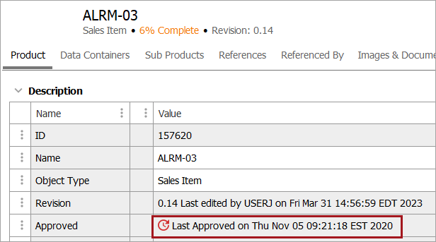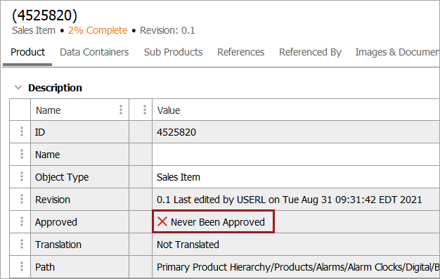 • Never Approved: Objects (products, classifications, assets & documents, or entities) that are workspace revisable and that have never been approved.