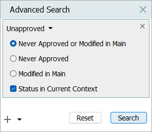 • Never Approved or Modified in Main: All objects that have 'Never been approved' and have been 'Modified in main'.
