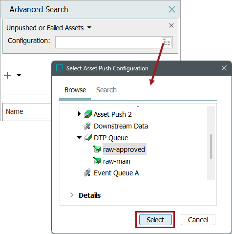 ) to display the Select Asset Push Configuration dialog. Select a configuration and click the Select button.