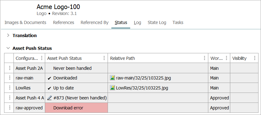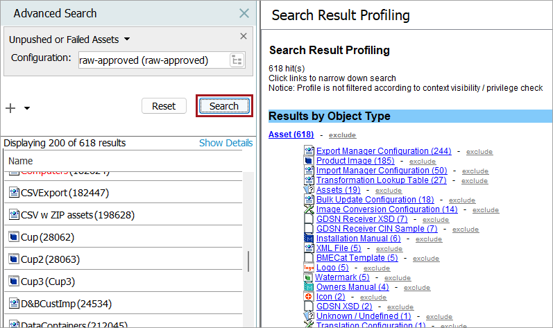 The Unpushed for Failed Assets search criteria allow you to identify assets that have not been successfully pushed. These assets have an Asset Push Status of 'Never been handled', 'Asset not in workspace,' or 'Download Error.'