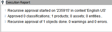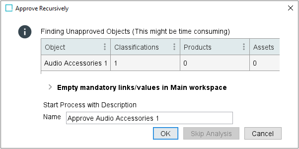 • Skip Analysis: When the number of child products is large, the analysis of unapproved or missing mandatory values and references can be time consuming. Click this button to stop the analysis and skip the report, but proceed with the approving recursively background process.