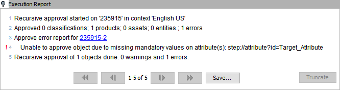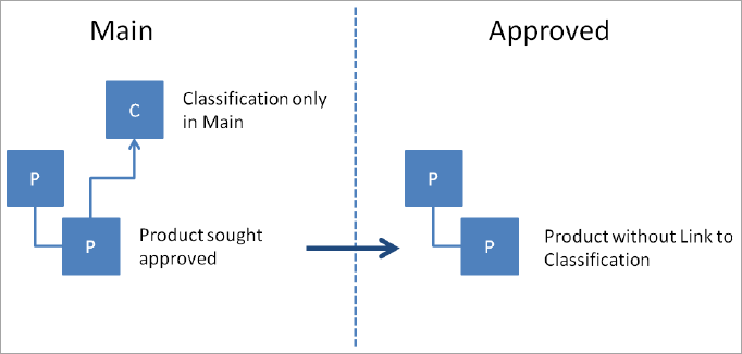 • A reference or link cannot be approved if the target does not exist in the Approved Workspace, i.e., if a product or classification is referenced with another product, asset, or classification, then the referenced product, asset, or classification needs to be approved first before the actual product or classification is approved.