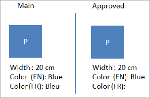 To illustrate this concept, refer to the figure below in which object 'P' has values for the attributes Color and Width in the Main workspace. While Width is not dimension dependent, Color is dimension dependent and has different values in two contexts: 'Blue' in the English context and 'Bleu' in the French context. If the object is approved in the English context, only the data visible in the English context is reflected in the Approved Workspace. Because of this separated approval, the object must also be approved in the French context to be completely approved, indicated by a green checkmark in the Approved parameter. Until all contexts are approved, the object in the English context has the status 'Approved in Current Context on [date + time]', indicated by a yellow checkmark, and the object in the French context has the status of 'Last Approved on [date + time]', indicated by a red clock.