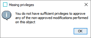 If you have modified attributes values for which you do not have Approve Privileges, a 'Missing privileges' dialog displays.