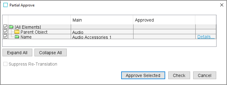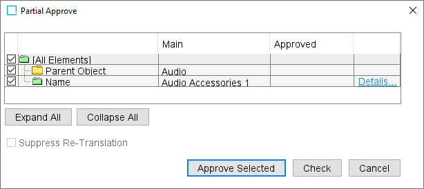 To expand an element group click the + sign next to the element group. To collapse the element group, click the - sign next to the element group. To expand all elements in the dialog, click the Expand All button. To collapse all elements in the dialog, click the Collapse All button. To check if the selected elements can be successfully approved, click the Check button to display an approve report that summarizes the results.