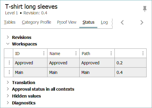 The status of an object in the various workspaces can be viewed in the Status tab in the Workspaces section of the relevant editor.
