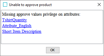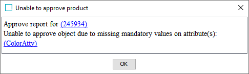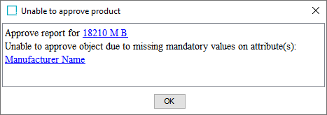 • If the product cannot be approved (for example, due to mandatory values or references being empty), the dialog provides details, as shown below:
