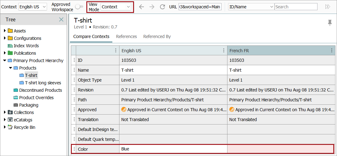 If Color is set as a mandatory attribute in the French context but is left empty, then an empty mandatory attribute warning will display when attempting to approve the object in the French context.