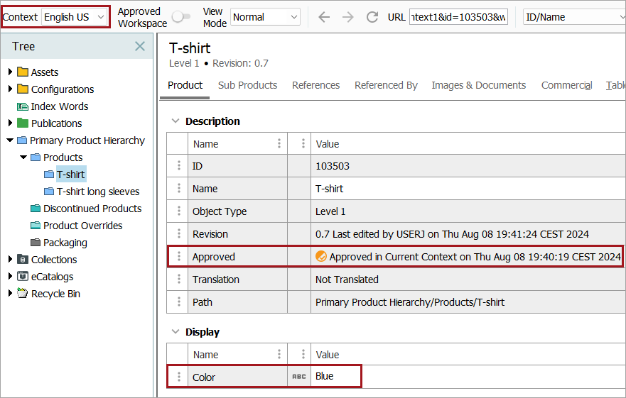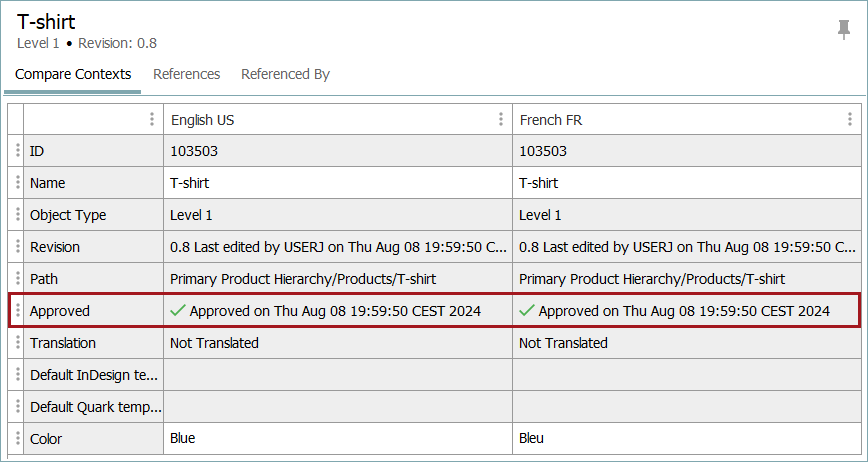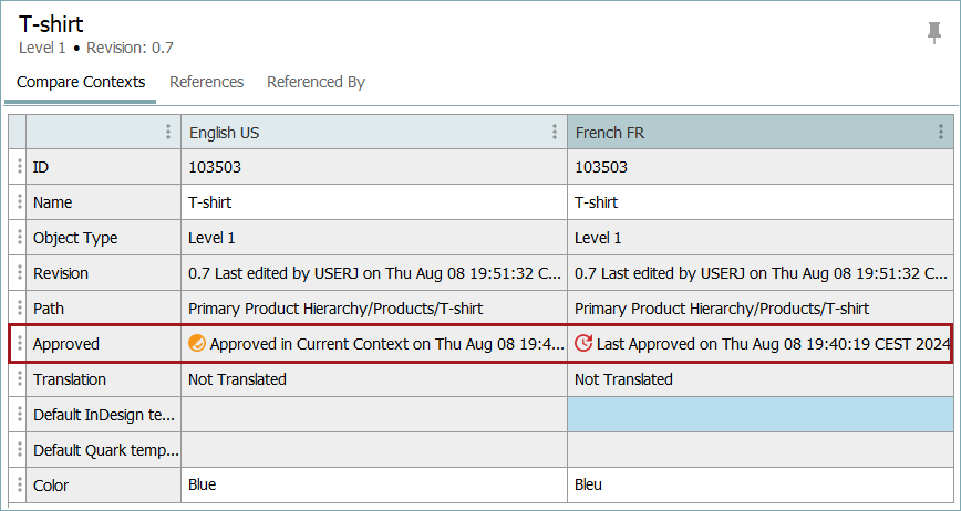 All mandatory attributes will be checked upon approval to notify is any are empty in the context in which the object is being approved. For example, in the first of the images shown below, the value added for the mandatory attribute 'Color' in the English context is 'Blue'. The object can be approved in this context without any issue. The approval icon is for the current context only, so in this example, the English context displays the partial approval icon.