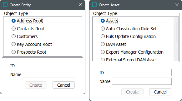 Selecting the right-click option will open a Create dialog, appropriate for the selected object super type (e.g., Create Assets for assets and Create Entity for entities). The options available in the dialog are based on the data model defined in System Setup. For example, the Object Type selection will vary based on the allowable object types under the selected parent, and ID will only be available for population if the object type being created does not have autogenerated IDs applied.