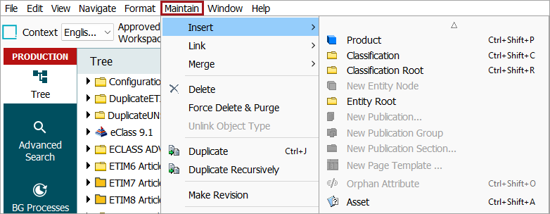 From the menu in the upper left corner of the workbench, select Maintain > Insert and choose the appropriate option. Note that it is required to use this method when adding a new root node to Tree. Additionally, note that the available options differ based on the active selection when the menu is accessed. For example, the below shows the available insert options when a classification has been selected, whereas the publication-related options would be enabled if a publication object had been selected instead.