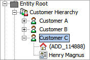 When an object type has been selected and an ID applied, the Create button will be enabled. Clicking Create completes the creation of the new object, which is then accessible in the Tree. If a Name is not supplied, the object will display in the Tree by the ID in parentheses. If a Name is supplied upon creation, the object will display in the Tree using the Name entry. For example, two new objects have been added under Customer C in the screenshot below. The first did not have a Name supplied, while the second did.