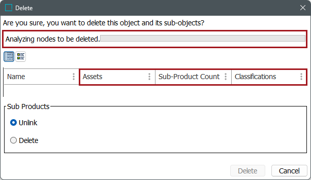 • Analyzing nodes to be deleted progress bar - displays as needed when large numbers of objects are being deleted. The Delete button is disabled while the analysis is running. Although the table is empty during the analysis phase, the impacted object types are displayed in the header.