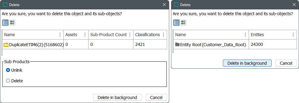 • Sub Products - when deleting a classification, select Unlink to leave the sub product in the hierarchy, or select Delete to delete the selected objects and the sub products linked to the classification.
