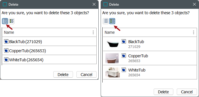 3. Review the Delete confirmation dialog, which varies slightly based on the object selected for deletion and the number of objects to be deleted.
