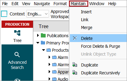 Important: As an alternative, an object can be deleted from the Tree and also purged in a single step using the 'Force Delete & Purge' option in the Maintain menu. This option bypasses the Recycle Bin. Do not use this option if deletion events are required for output to downstream systems since a DELETEAPPROVAL event is not generated for 'Force Delete & Purge'. Refer to the Force Delete and Purge heading in the Maintain Menu topic of the Getting Started documentation.