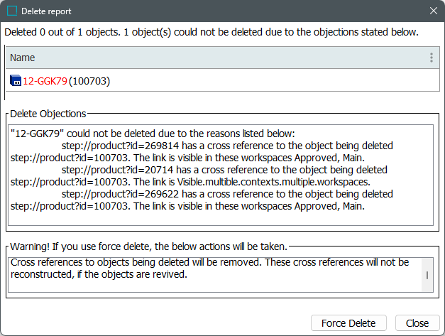 • If errors or warnings are displayed in the ‘Delete report’ window or the ‘Delete large number of objects’ BGP, it is recommended to note the issues, click Close, and manually resolve them. Review the warning section to decide if the Force Delete option is a good choice.