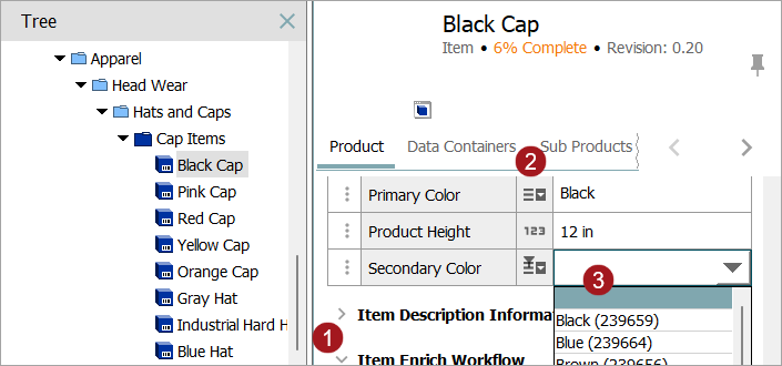 To edit data, click in any editable field. Text attributes can be edited by typing directly into the field, while LOV attributes will provide a dropdown from which users can select a value, as shown below (3).