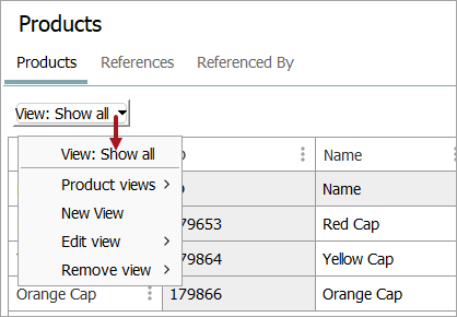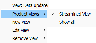 Once one or more views have been created, they are available for selection from the View menu under Product views.