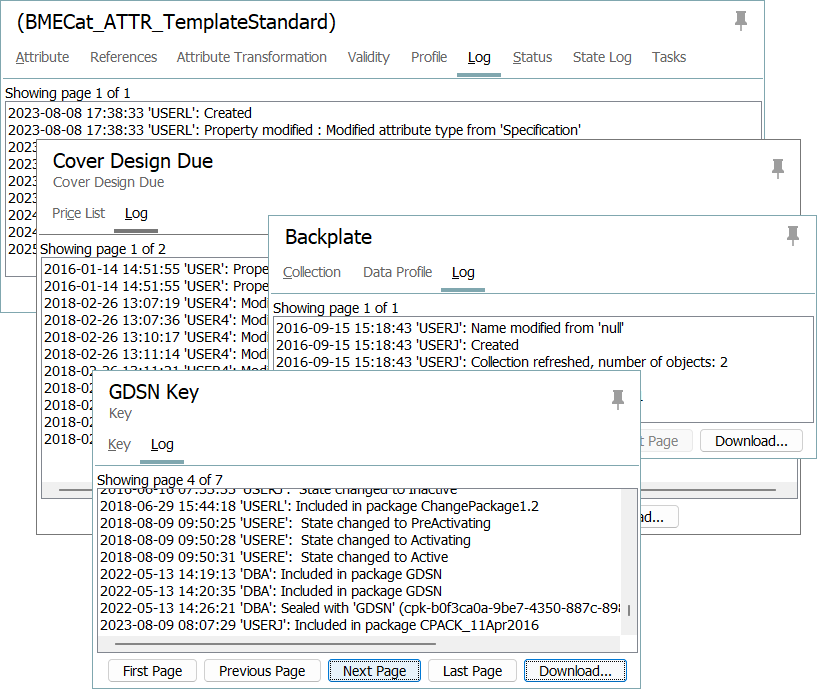 When appropriate, additional information about the Log tab in a specific object type is defined in the section that addresses the particular functionality, such as references, business rules, event processors, or users and groups.