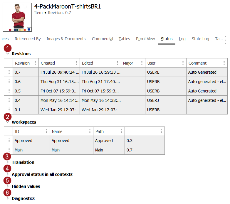 - Workspaces: All the workspaces that the selected products are in will display, as well as the revision number that exists in that workspace. Generally speaking, if the object has been edited since it was approved, the Main and Approved workspaces will hold different revisions. However, it should be noted that not all changes to an object generate a revision. More information on this is available in the Revisions topic in the System Setup documentation. For more information on workspaces in general, refer to the Workspaces topic in the System Setup documentation.