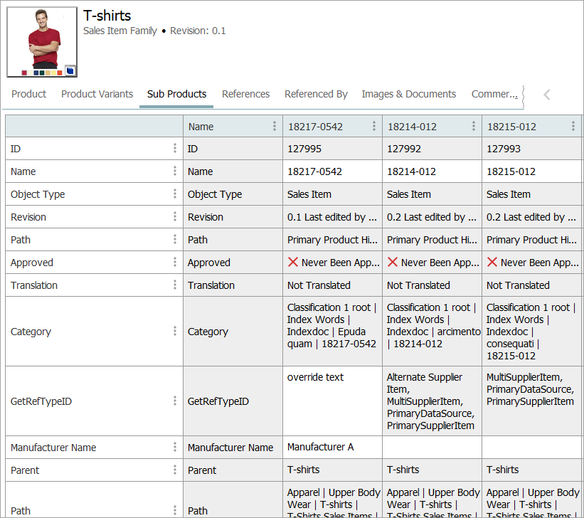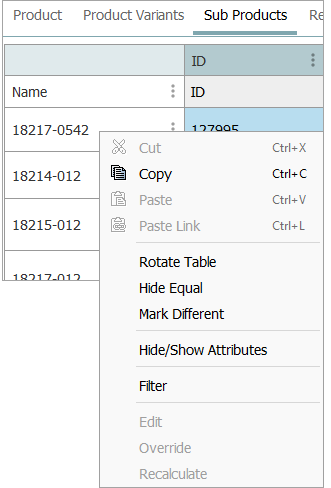 When the Sub Products tab is accessed on an object of the product super type, all direct children of the selected node are displayed. If privileges allow, data can be edited on the displayed objects by clicking directly into any editable field. Standard editing capabilities are available within this interface (as described in the Editing Objects in the Tree Tab topic) including copy / paste functionality using Ctrl + C and Ctrl + V.