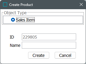 Selecting Add Product opens a Create Product dialog allowing the user to input data to create a new object, which will be added as a child to the currently selected node. The options available in the dialog are based on the data model defined in System Setup. For example, the object type selection will vary based on the allowable object types under the selected parent, and ID will only be available for population if the object type being created does not have autogenerated IDs applied.