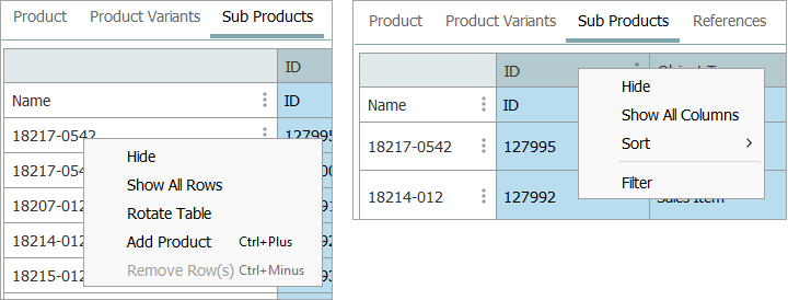 Right-clicking within the header field exposes different options than within the data fields, including an option to add a product.